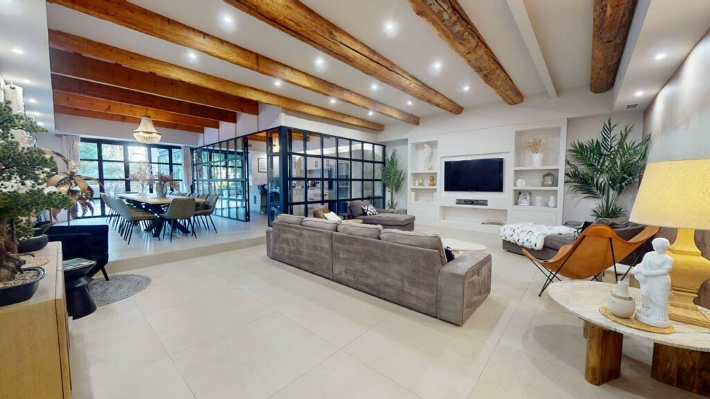 Le grand salon est le cœur de la maison : un espace lumineux et modulable pouvant accueillir jusqu’à 50 personnes. Parfait pour les moments en famille comme pour les séminaires ou cocktails, il offre des volumes généreux et une atmosphère contemporaine où chacun se sent immédiatement à l’aise.